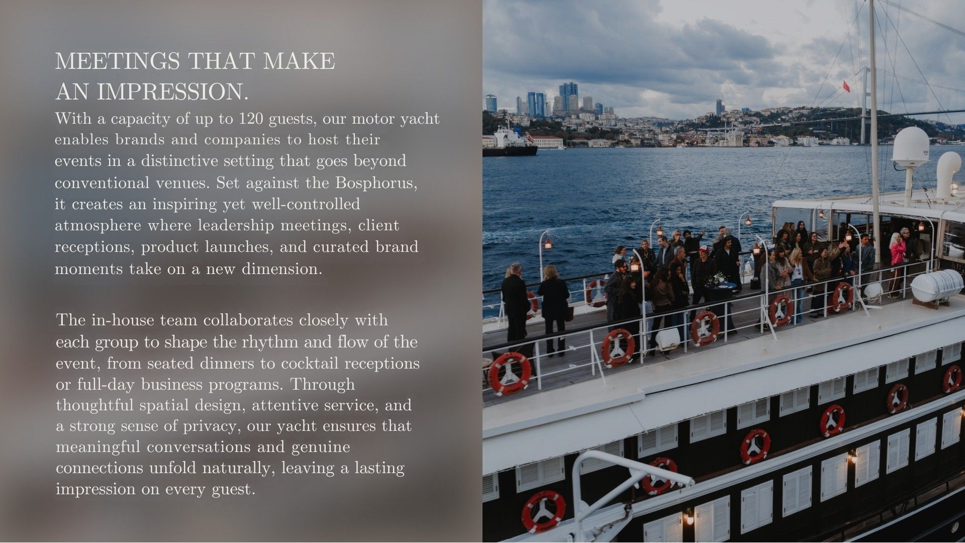 This elegant motor yacht is ideal for private wedding events, corporate gatherings, sunset dinners, and exclusive overnight stays on the Bosphorus.